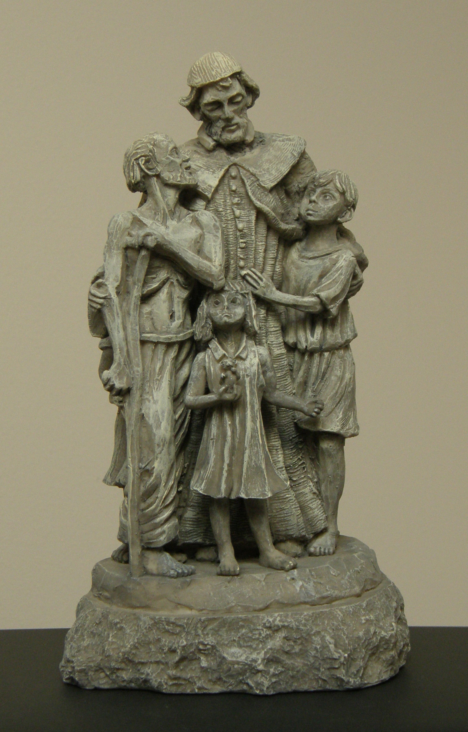 Commercial reproduction of Timothy Schmaltz statue, Vincent de Paul with poor; original in Vincentian offices, Montebello