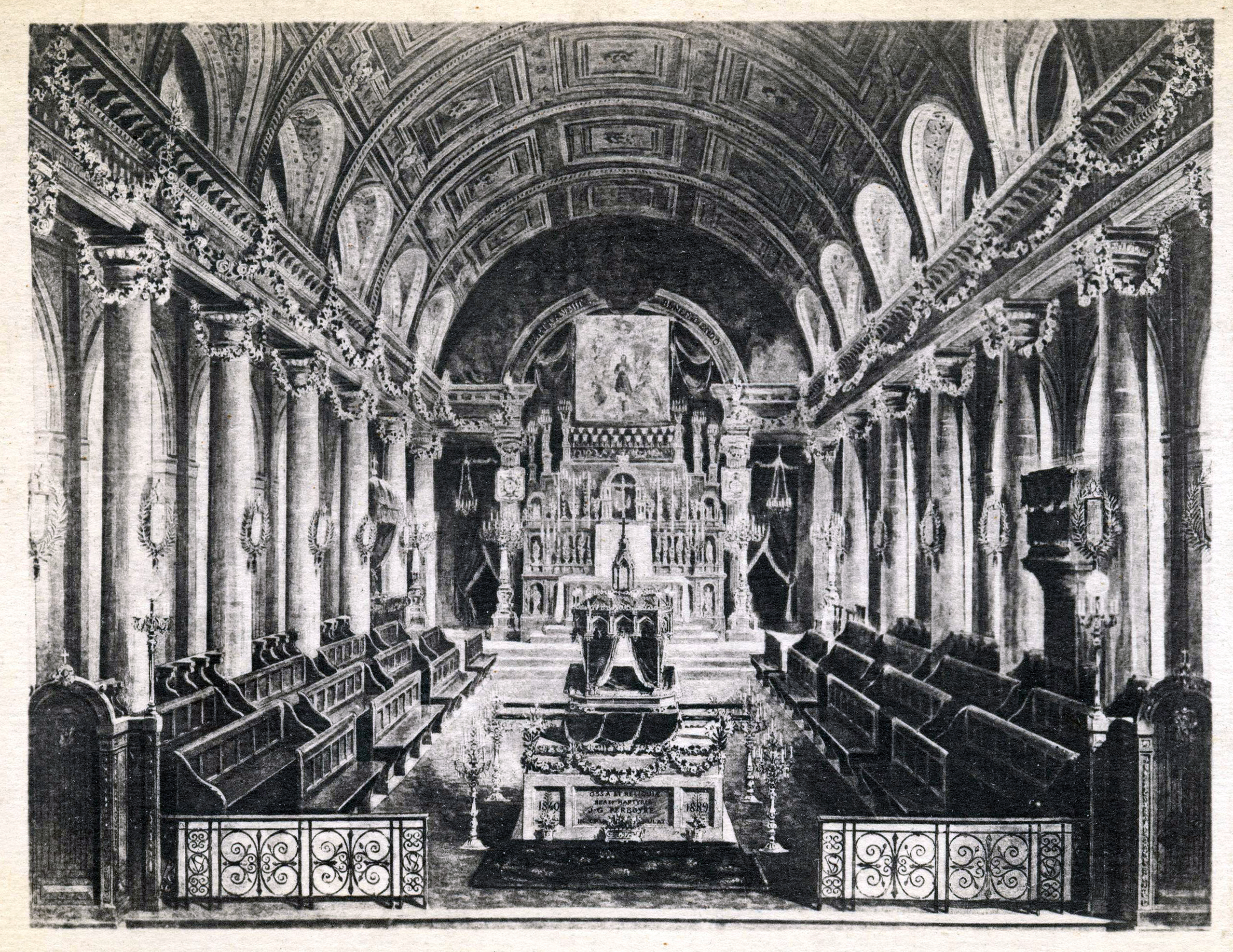 Chapel decorated in 1889 for triduum of John Gabriel Perboyre beatification; pulpit at right side; bishop's throne on the left front