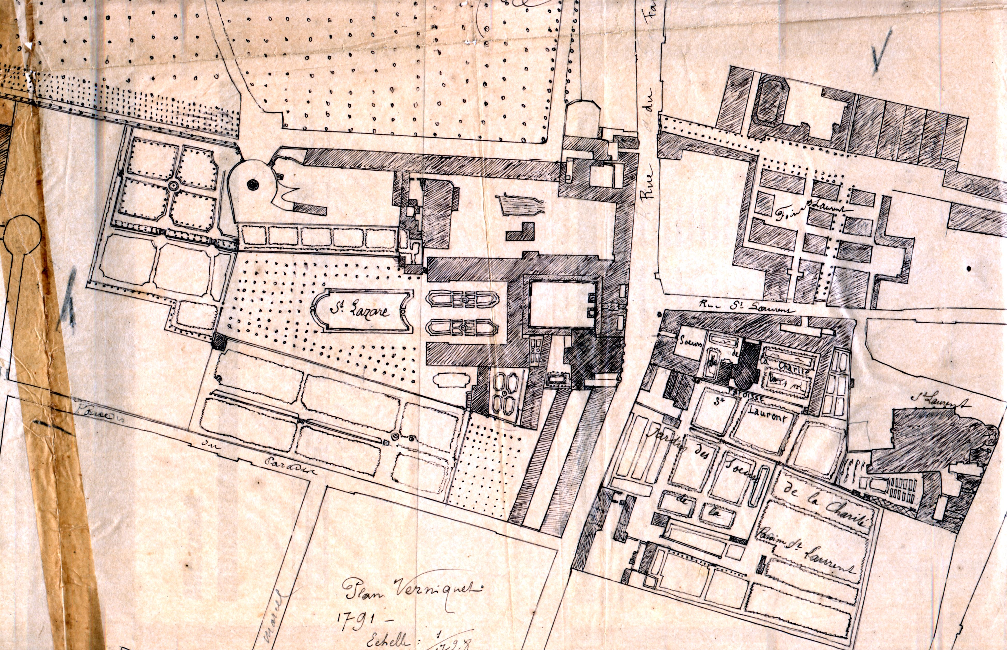 Copied from the Verniquet map of 1791; Prieuré de St-Lazare (en centre)- Foire St-Laurent (en face de St-Lazare, en haut)- Maison-Mère des Filles de la Charité (en face de St-Lazare, en dessous)- église St-Laurent á droite. Orientation : Nord en Haut