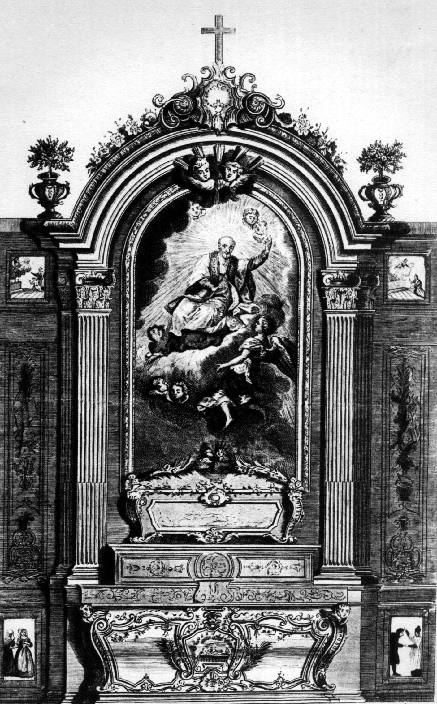 Painting now lost; original reliquary shrine destroyed at time of the Revolution. Engraving by TARDIEU, in Bibliothèque Nationale, estampes.