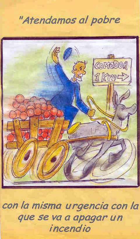 "Let us care for the poor person with the same urgency as if we were going to put out a fire." Dining room, 1 km.