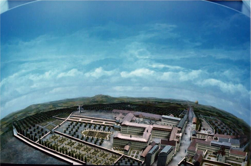 Diorama of St. Lazare at its great extent, under Jacquier, dated by Montgolfier balloon flight, to 27 August 1783. Balloon, an unmanned flight, visible in right background.