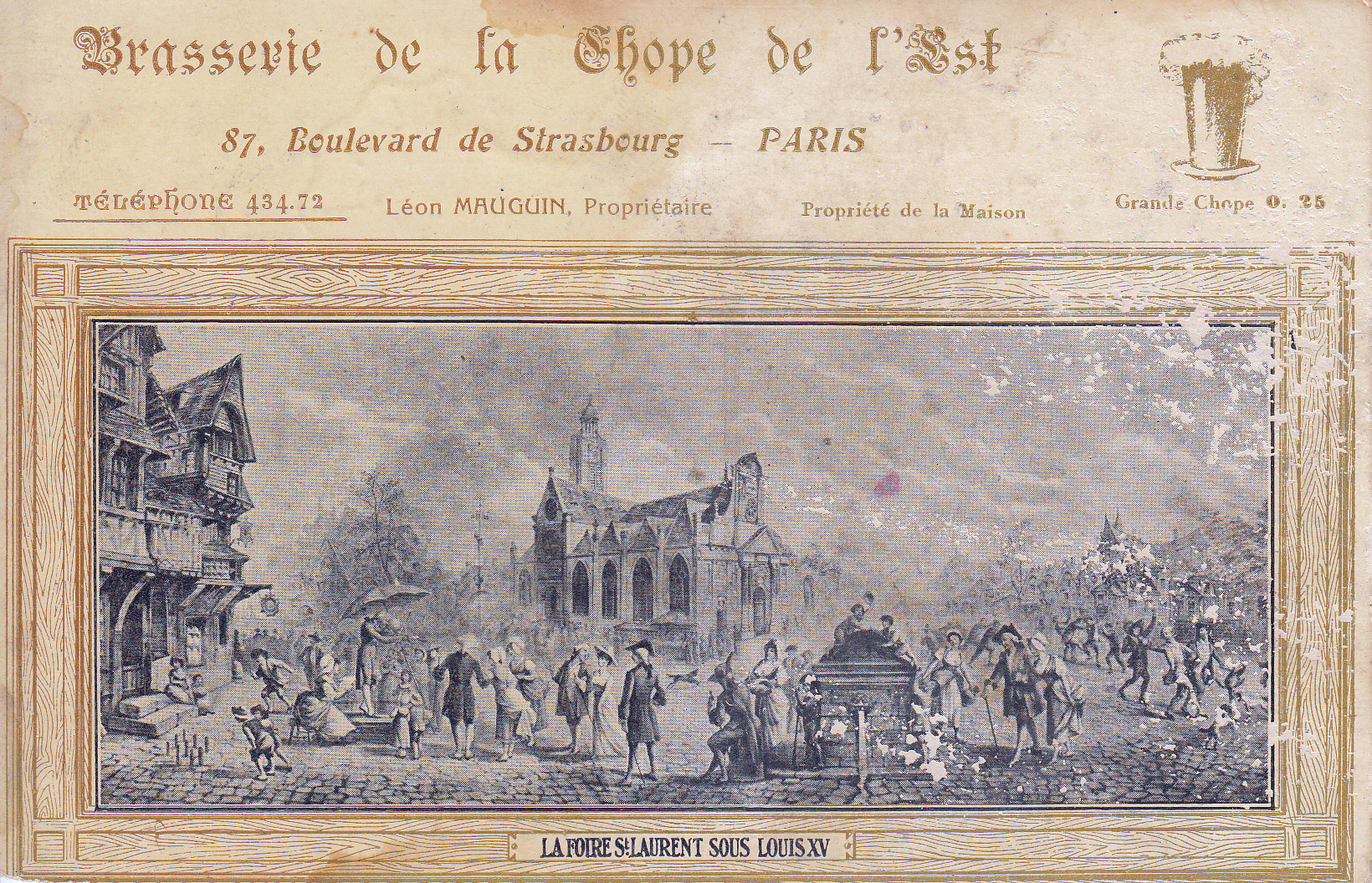 St. Laurent church in center; boys playing nine-pins, etc., post card prepared for commercial use.