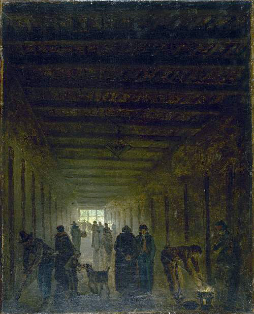 Prison during Revolution, by Hubert Robert, a prisoner; oil on canvas; corridor for male prisoners, called Germinal; served as interior walkway. Internet image