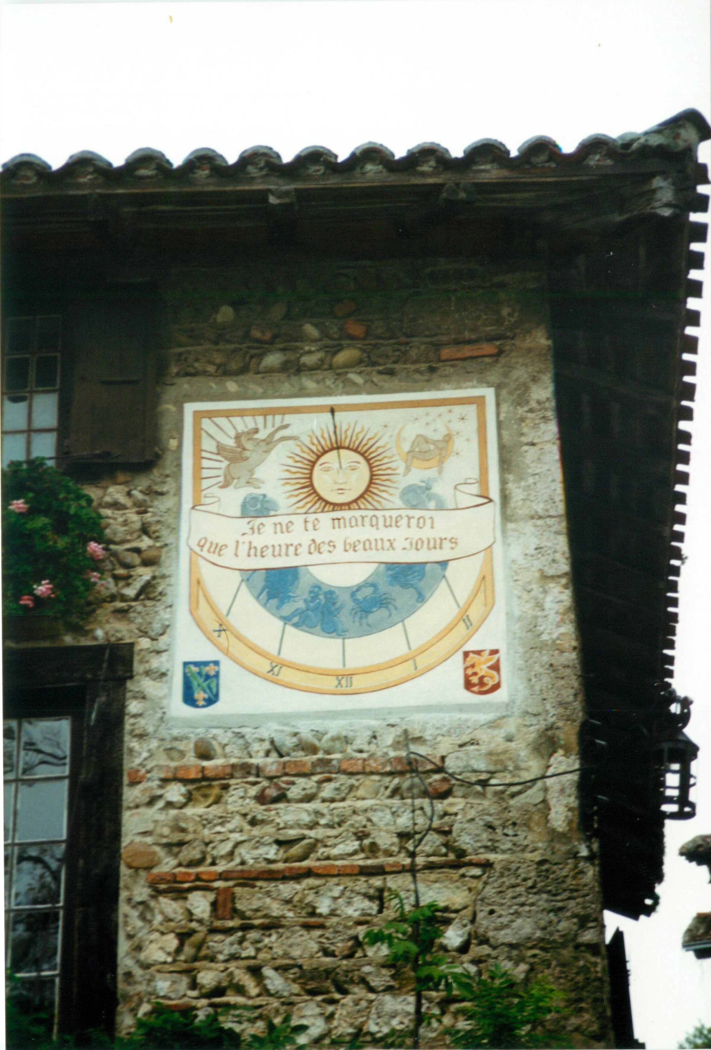 Sundial on main square; text: "I will mark only the time of the nice days"