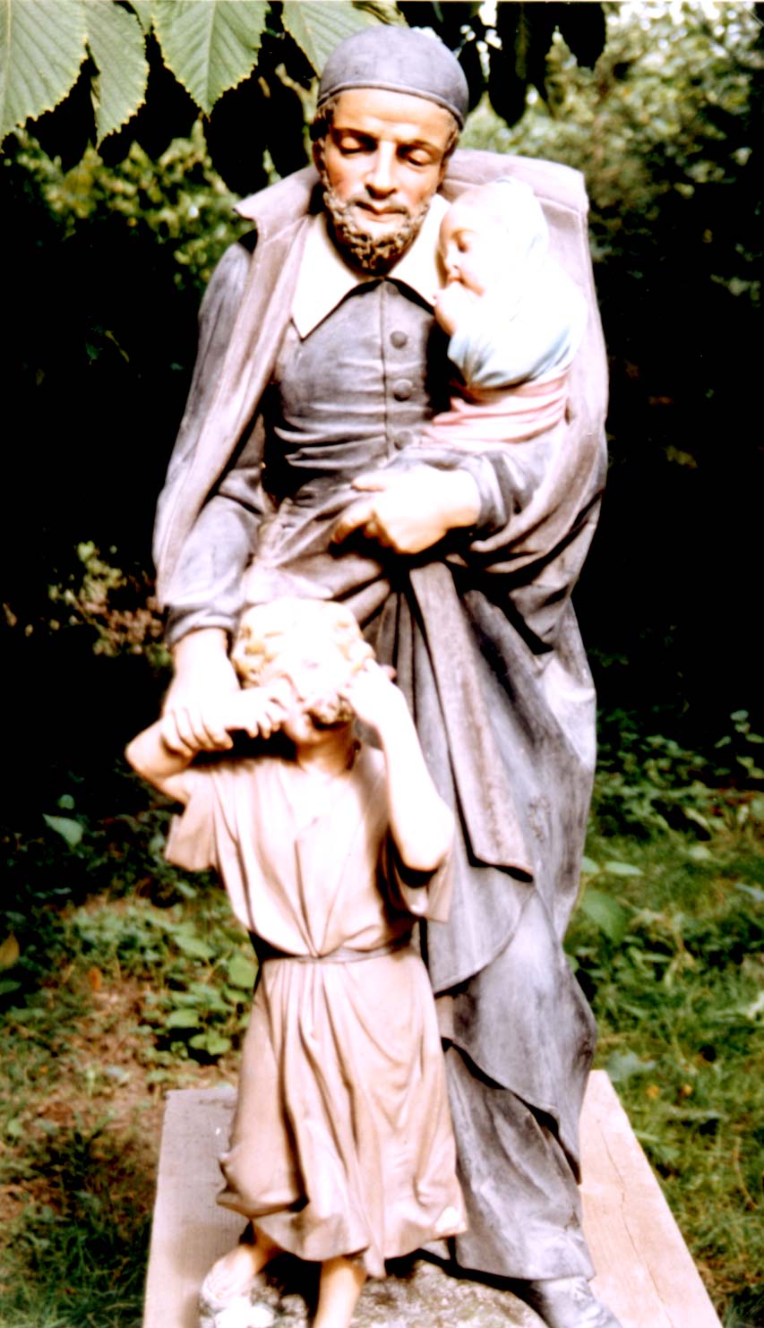 Outdoor statue, painted; Vincent de Paul, standing, cassock, cape, skullcap, with two children; original in Hungary, location unknown; may be internet image