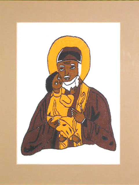 Vincent de Paul and one child on embroidered banner; probably Ethiopian or Eritrean; at Vincentian house, Isleworth, Middlesex, England.