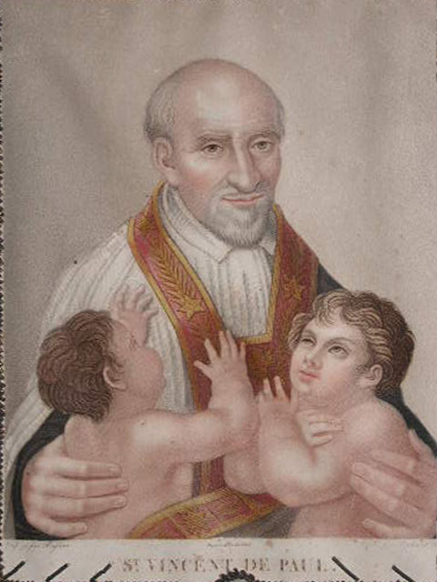 Painted or printed cloth, Vincent de Paul, cassock, surplice, red stole, holding two infants; original in museum of Daughters of Charity, Zaragoza