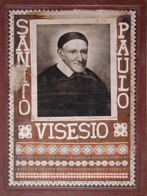 Vincent de Paul, engraving on paper, bust; mounted on native materials, with name in Fijian spelling. Original in Vincentian formation house, Suva, Fiji.