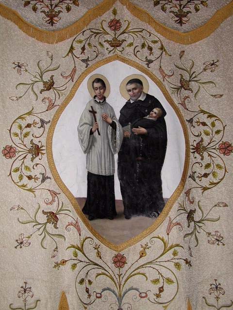 Embroidered processional banner, Vincent de Paul with infant, John Gabriel Perboyre contemplating the cross of martyrdom. Original in Vincentian church, Zagreb, Croatia.