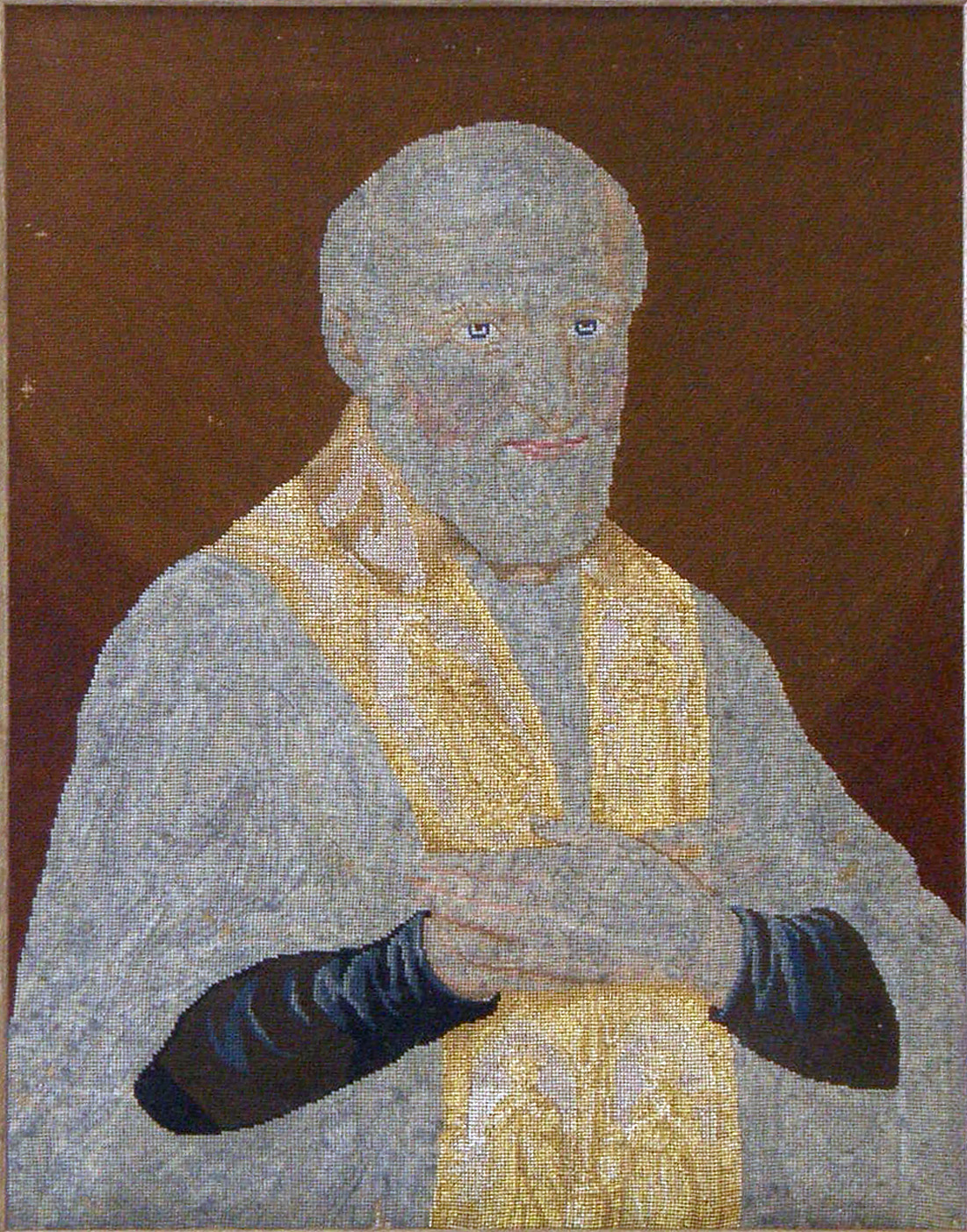 Needlepoint bust, Vincent de Paul, cassock, surplice, gold stole; original in archives, St. Joseph Provincial House; repr. with permission