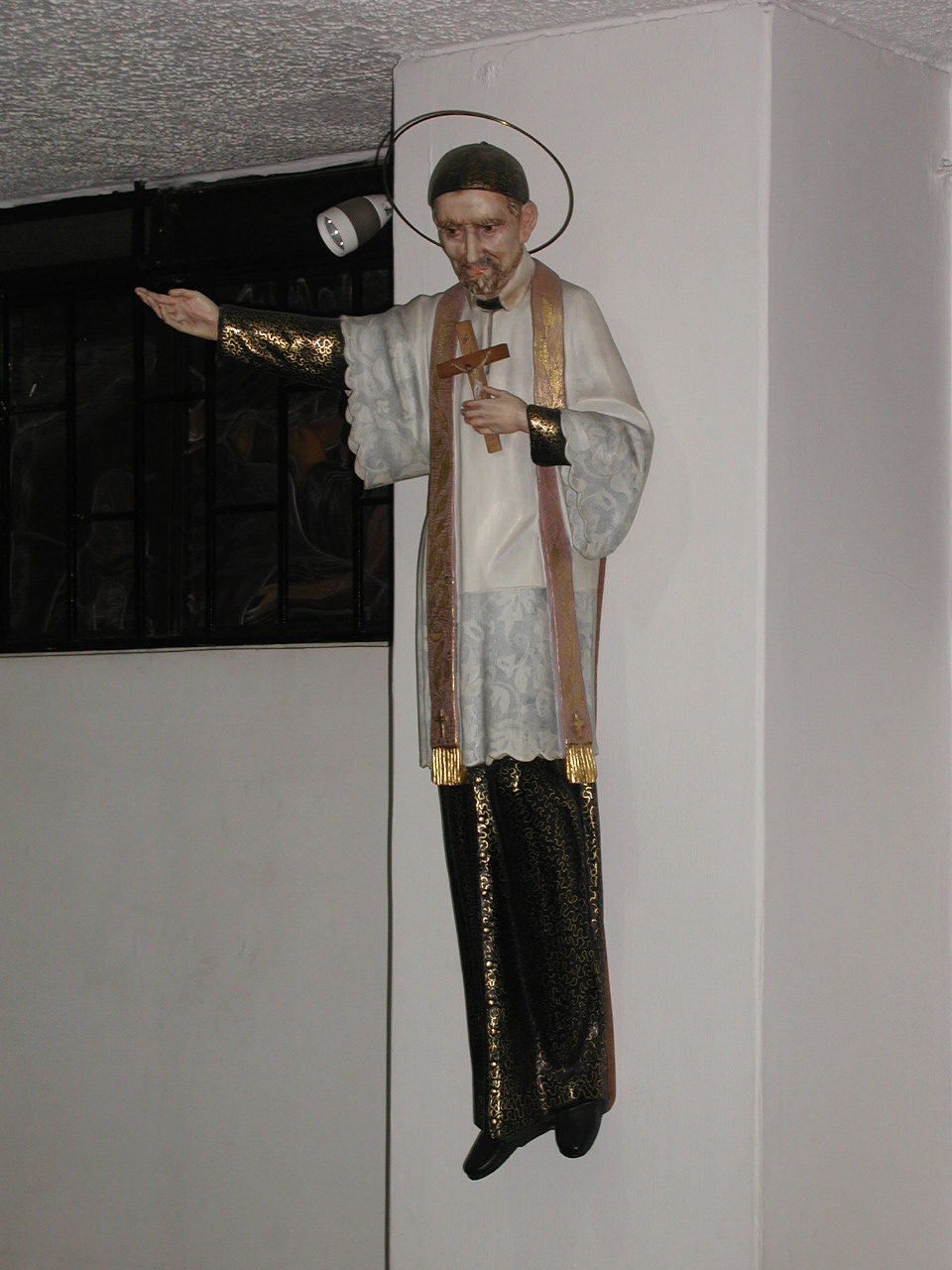 Vincent de Paul, in cassock (with gilding), surplice and purple stole; holding crucifix; gesturing. Original in Vincentian provincial house chapel, Bogota