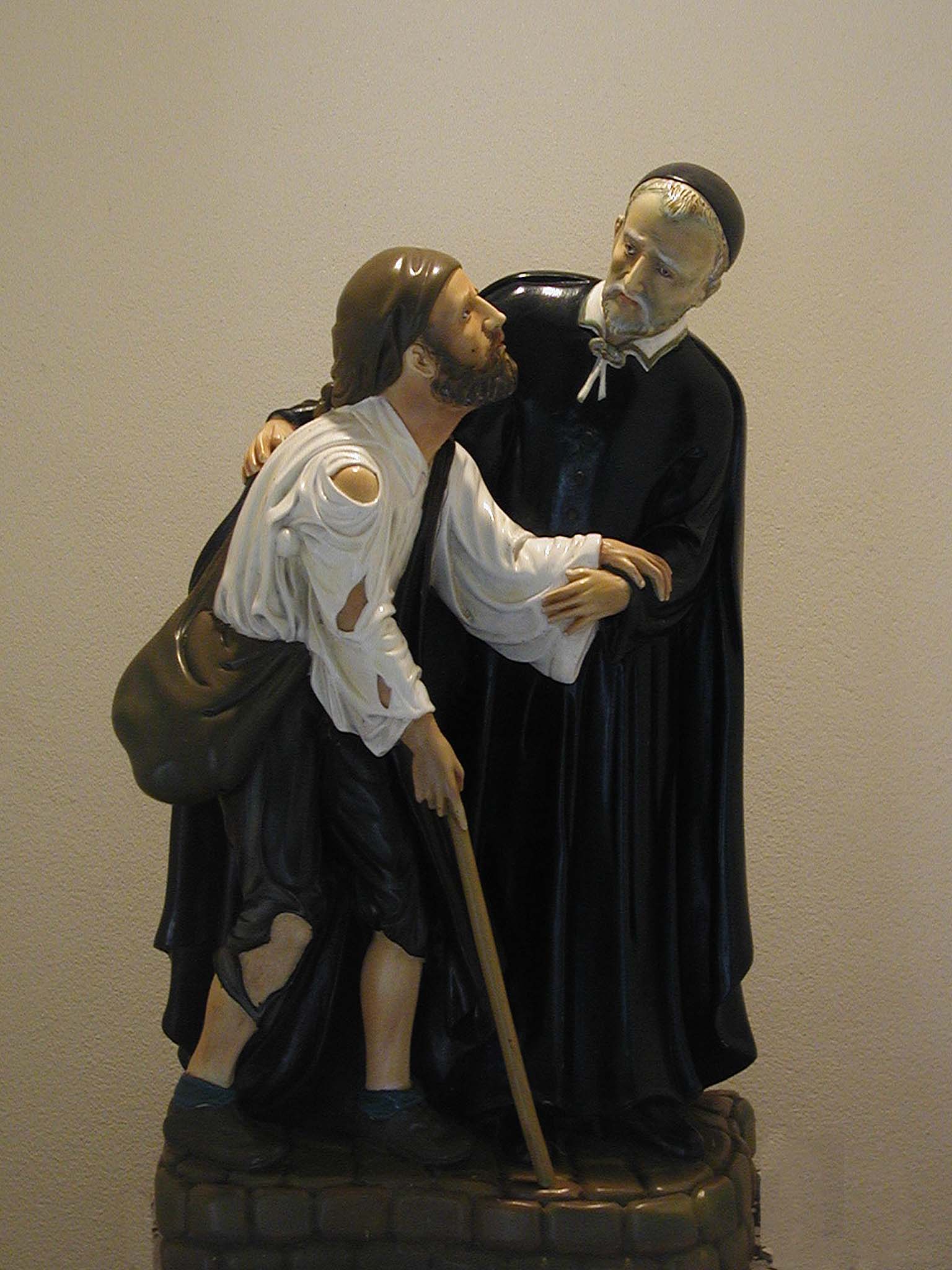 Vincent de Paul, in cassock and mantle, helps handicapped man. Original in Vincentian formation house, Wailoku, Suva
