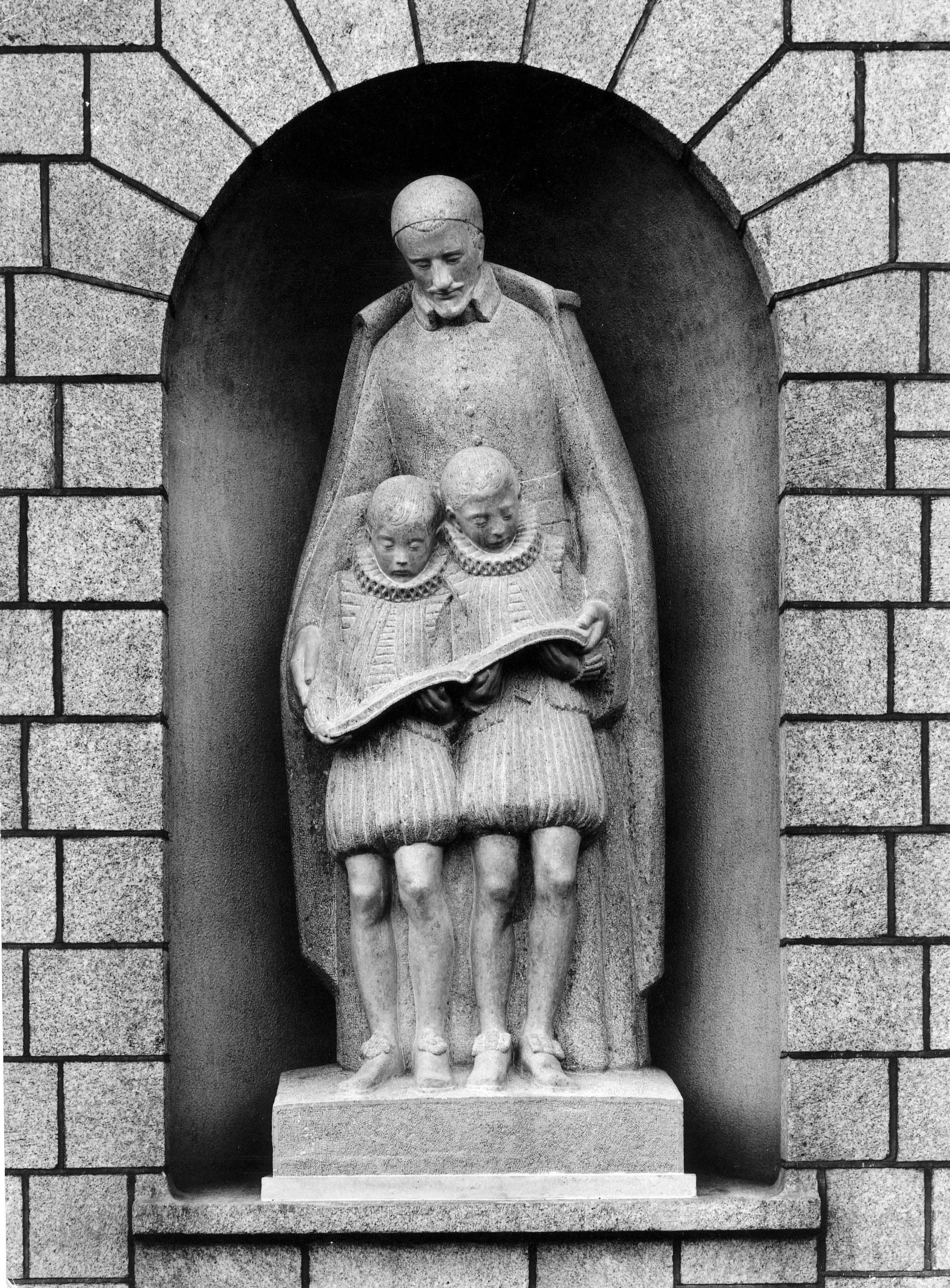 Statue of Vincent de Paul as tutor of two Gondi boys; in niche at St. Vincent's College, Castleknock, Dublin; copy in Colombia