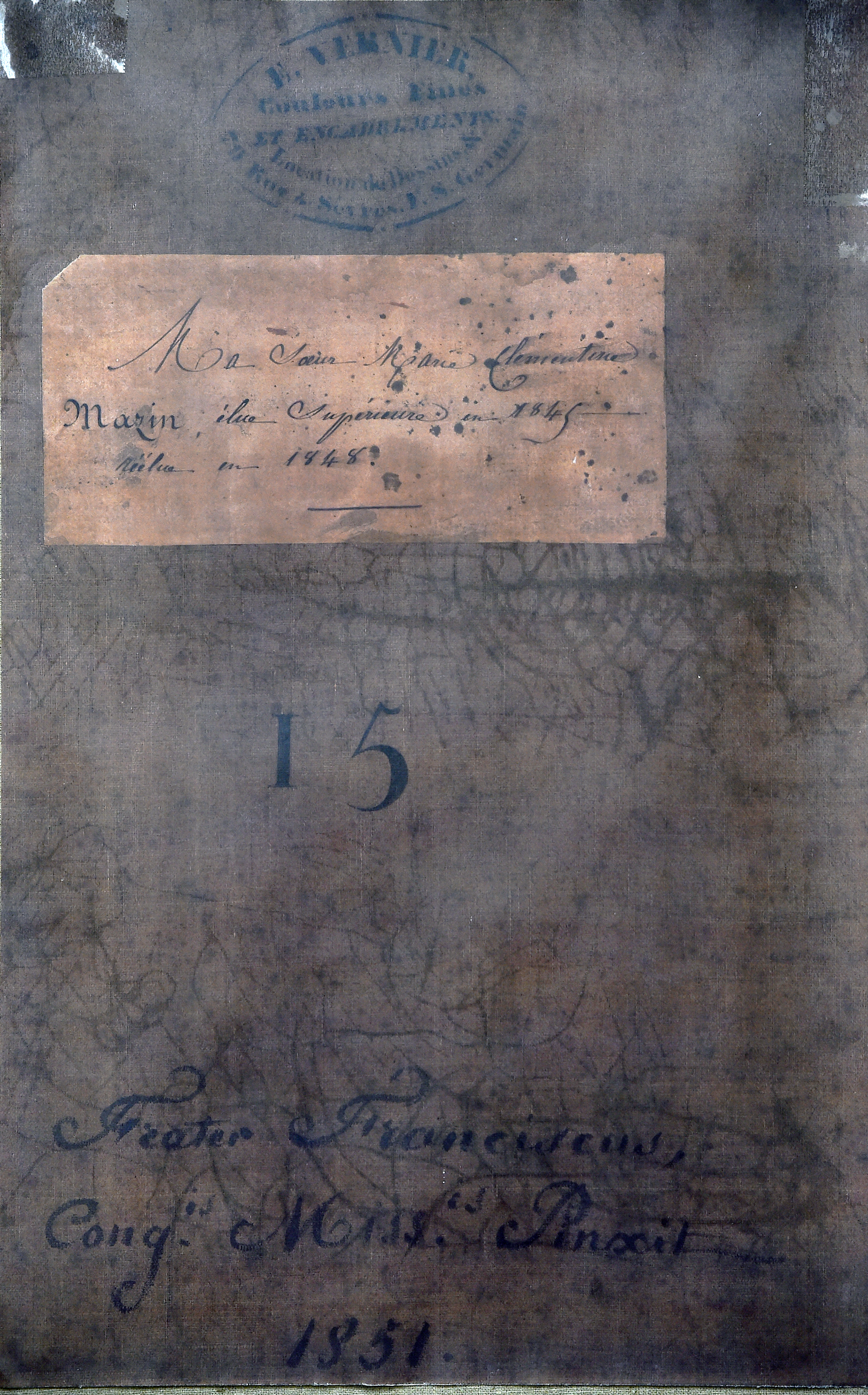 Signature, date, and identification. Large number 15 is not explained. Commercial stamp: E. Vernier, / Couleurs Fines / et encadrements / Location de Brosses, etc. / 70 rue de Sevres / I (?) S. Germain (sells colors, does framing, rents brushes)