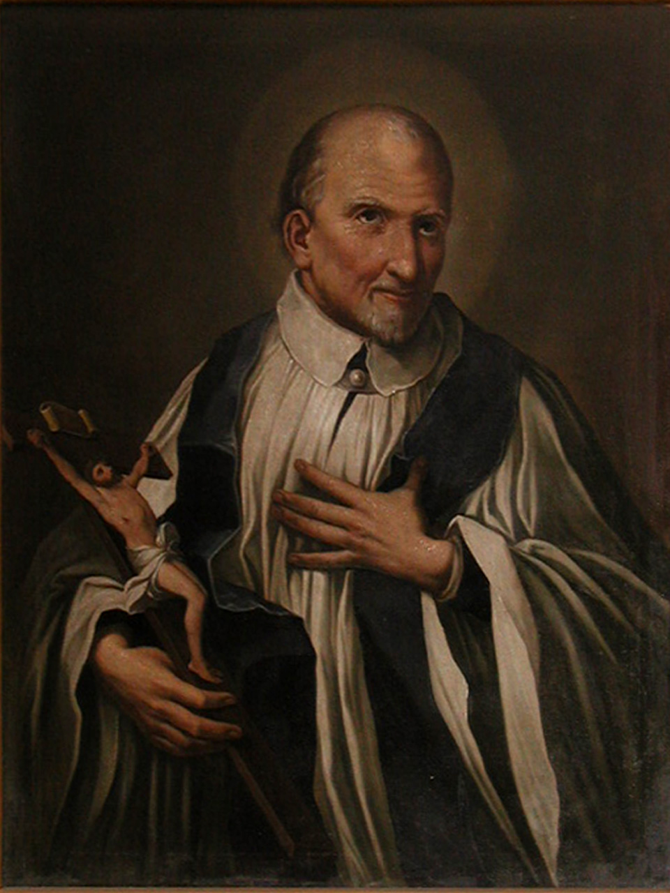 Oil painting, Vincent de Paul in surplice and dark stole, holding biretta, cradling crucifix in right arm; original in Vincentian house, Krakow, Poland; others in Krakow, Rome, Austin TX