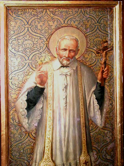 Framed painting on wood, incised background; Vincent de Paul in surplice and white stole, holding crucifix; original in Daughters of Charity museum, Zaragoza