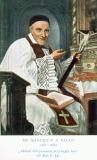 Printed card, copy of painting, Vincent de Paul seated, with book, gestures to crucifix on table or altar. Text in Polish below
