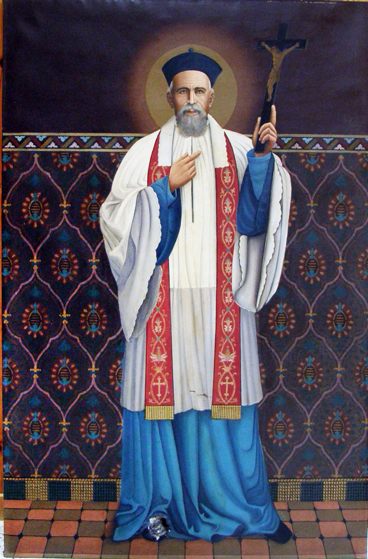 Clet, standing, blue cassock (Chinese style?); large format oil painting, in former CM house of German province in Theux, Belgium