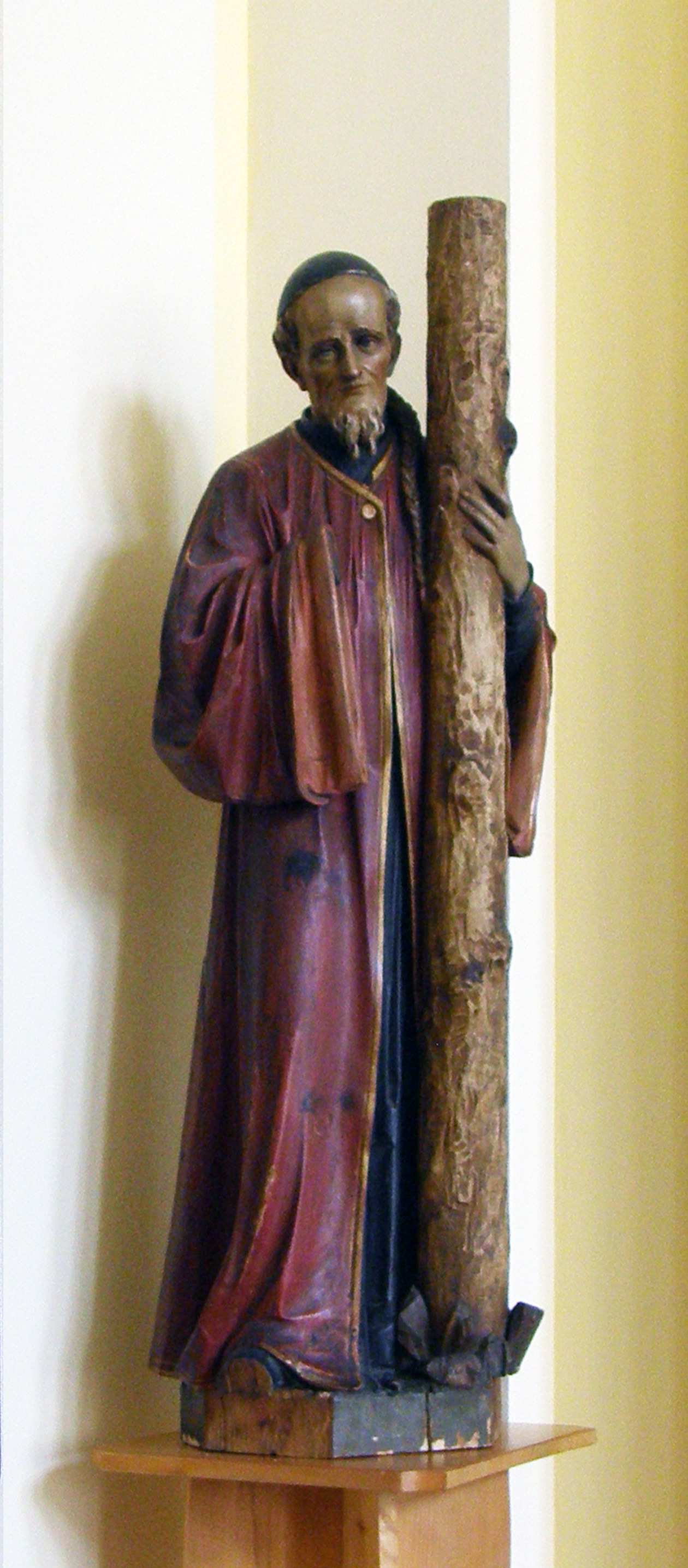 Damaged wooden statue (missing hand, transverse bar of cross); formerly in CM scholasticate, Szob; restored after 1990 to CM school, Szob