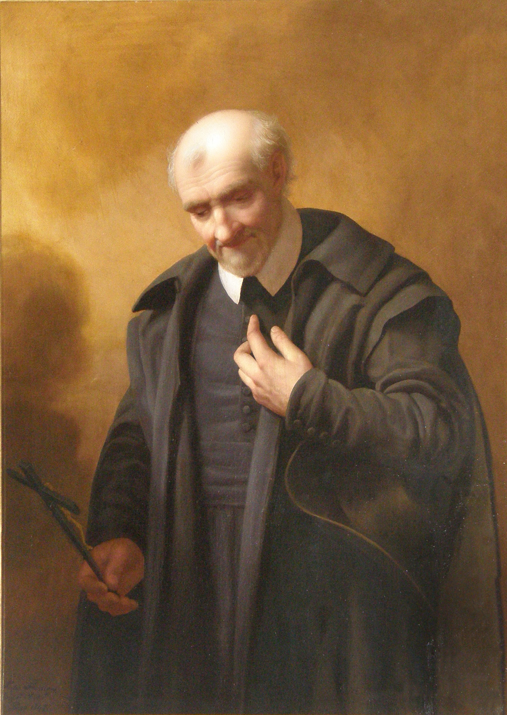 Oil painting, Vincent de Paul, standing, cassock, mantle, cinceture, no skullcap, holding hat, contemplates crucifix; artist: Bro. François Carbonnier; original in Vincentian mother house, Paris