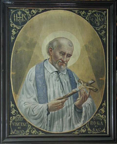 Oil, Vincent de Paul, standing, cassock, surplice, violet stole, contemplating crucifix; text in Croatian; "Pray to God for us." Original in Vincentian house, Thessalonika