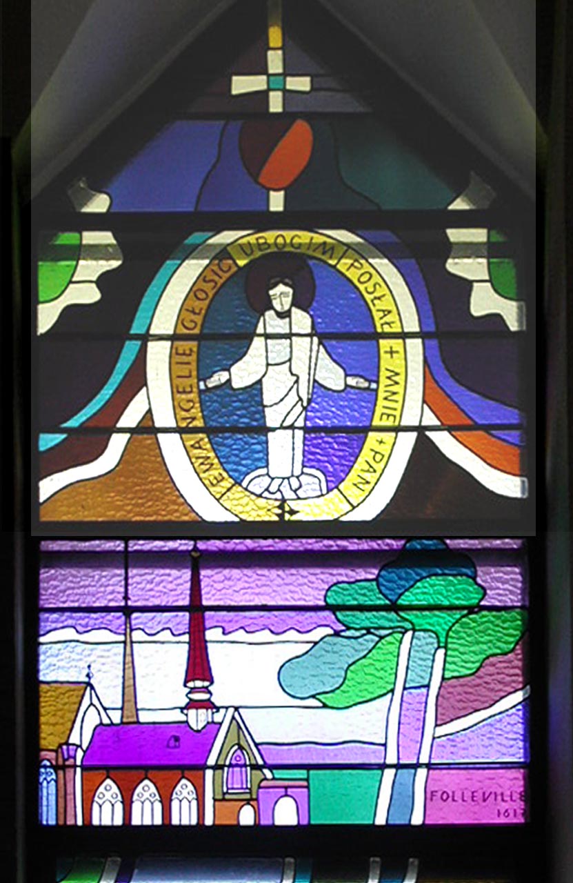 Polish text: The Lord has sent me to preach the Gospel to the poor. -- Part of church at Folleville below.