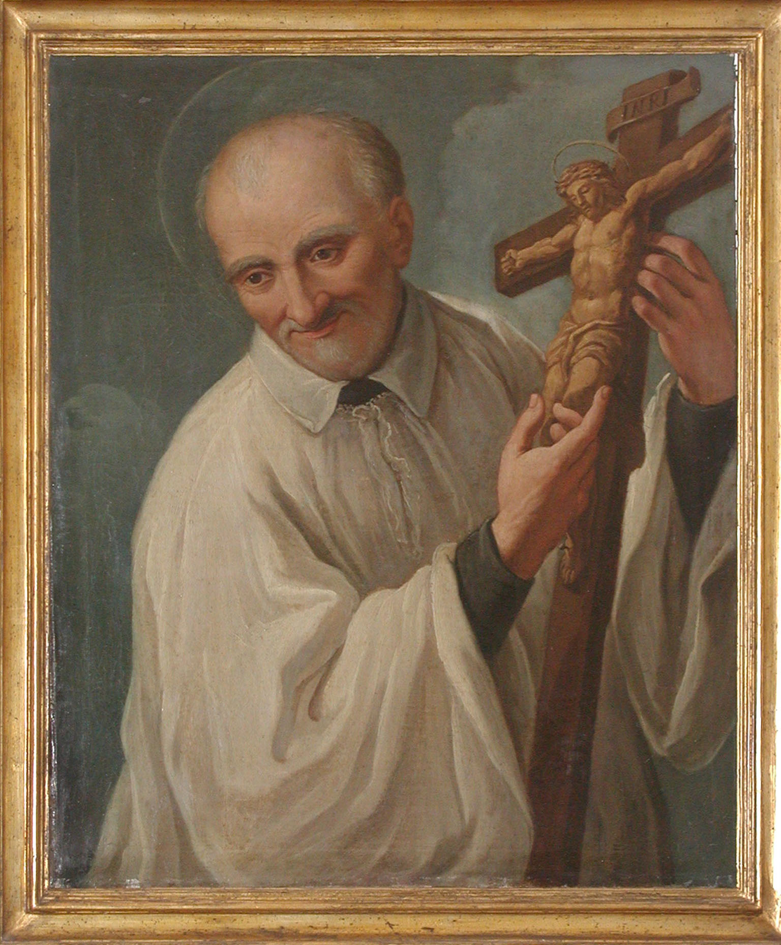Oil, Vincent de Paul, standing, cassock, surplice, halo; gesturing toward crucifix; original in private collection, Lisbon