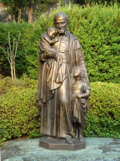 Bronze-colored outdoor statue, Vincent de Paul with two children, traditional pose. Original in Korea