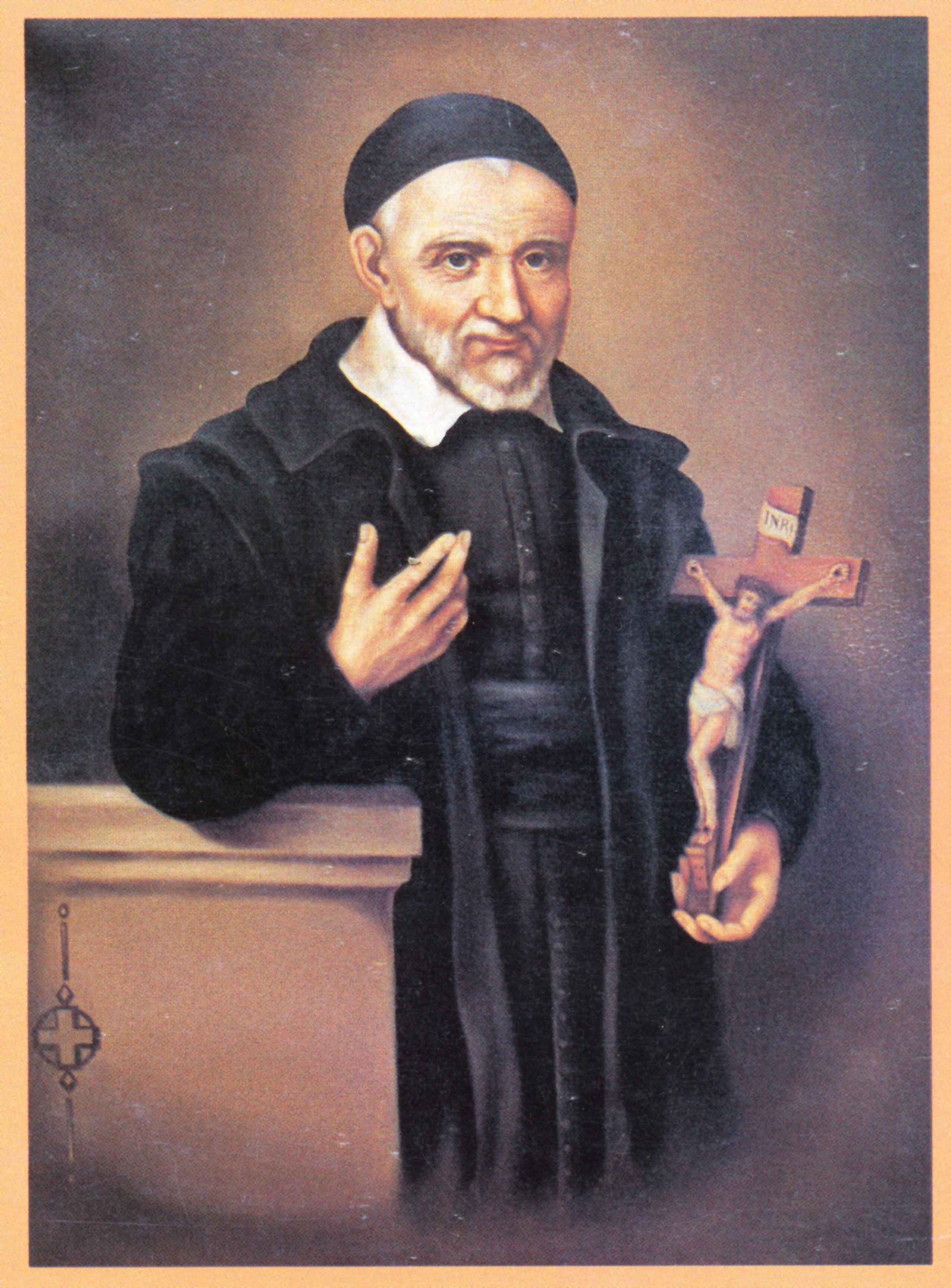 Oil on canvas; VdP, standing, cassock, cincture, skullcap, with crucifix; right arm resting on altar (?); artist unknown; used as book jacket; original in La Milagrosa, Madrid
