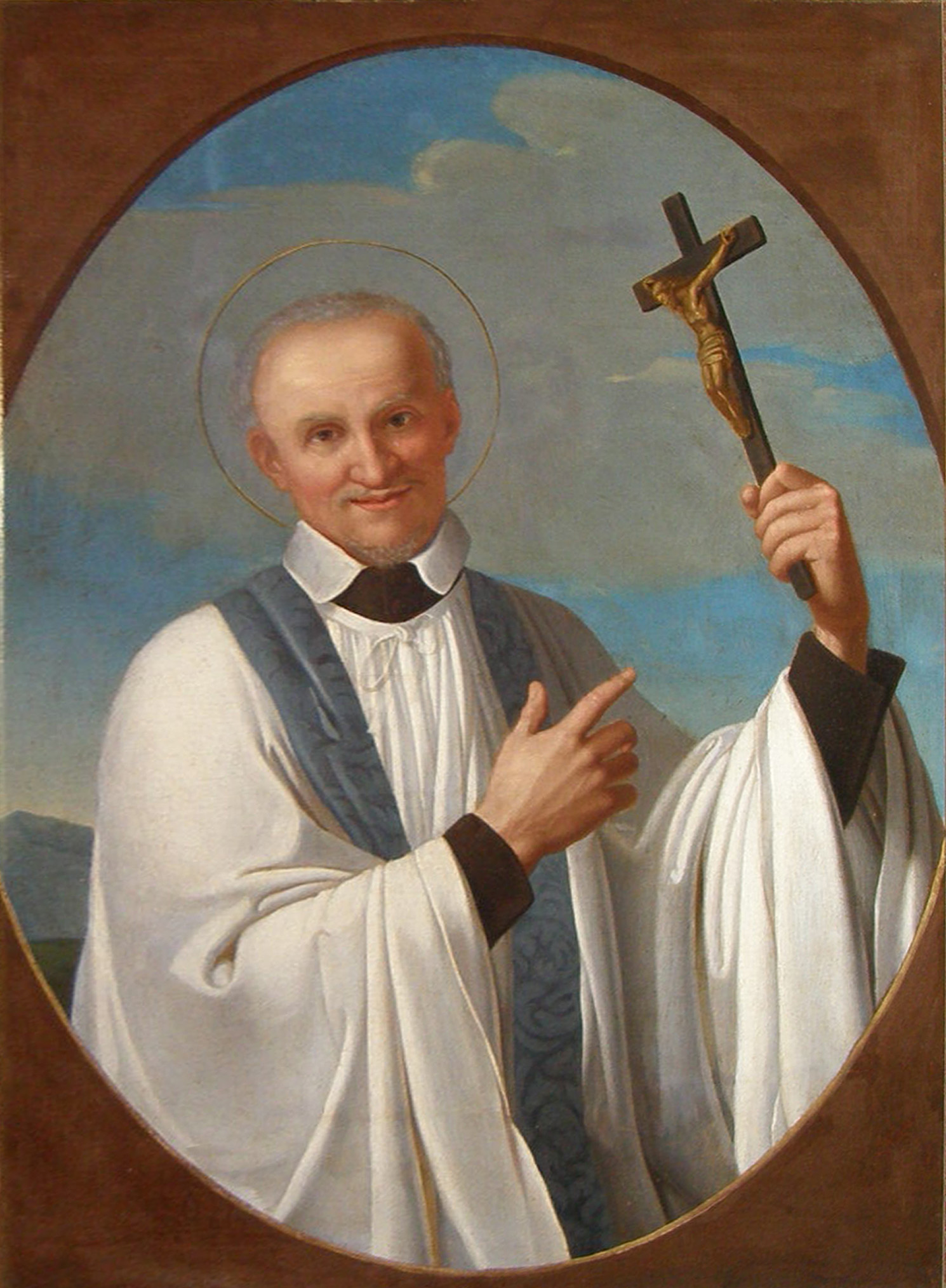 VdP, standing, outdoors, cassock, surplice, blue stole, halo, gesturing to crucifix in his left hand; based on standard Italian depictions, here with Vincent alone; private collection, courtesy of Kevin Fausz, CM