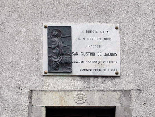 Text: In this house was born St. Justin de Jacobis, on 9 October 1800, a missionary bishop in Ethiopia. (Festival committee, 31-August-1975)