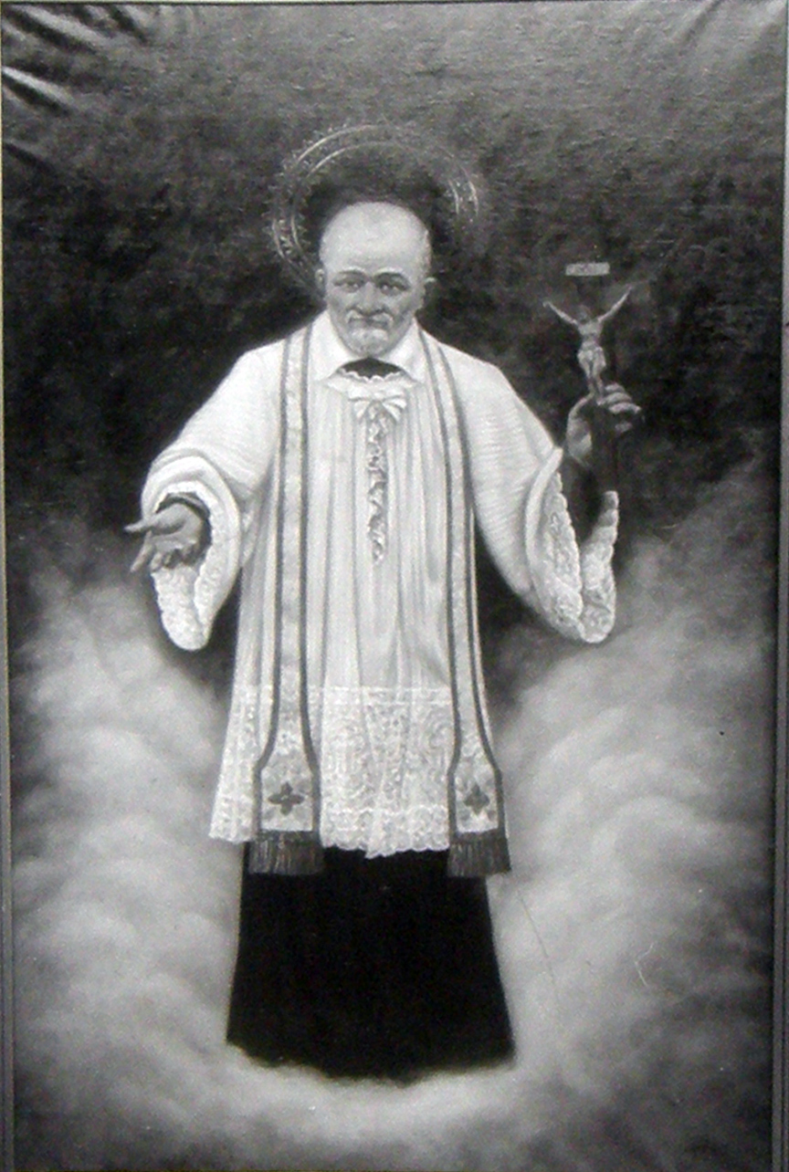 Vincent de Paul, standing on clouds, cassock, surplice, stole; showing crucifix; painted copy of a traditional Spanish statue with metal halo