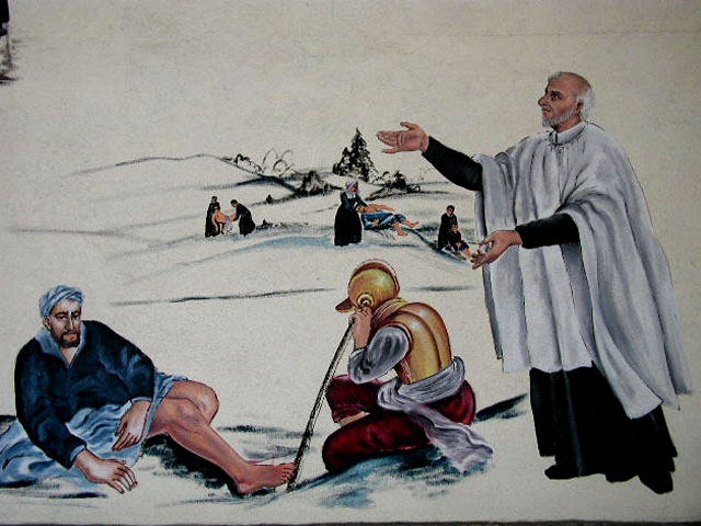 Mural, Vincent de Paul, Daughter of Charity, Vincentian priests, caring for wounded soldiers; original in Vincentian Provincial House chapel, Guatemala City; based on beatification engravings