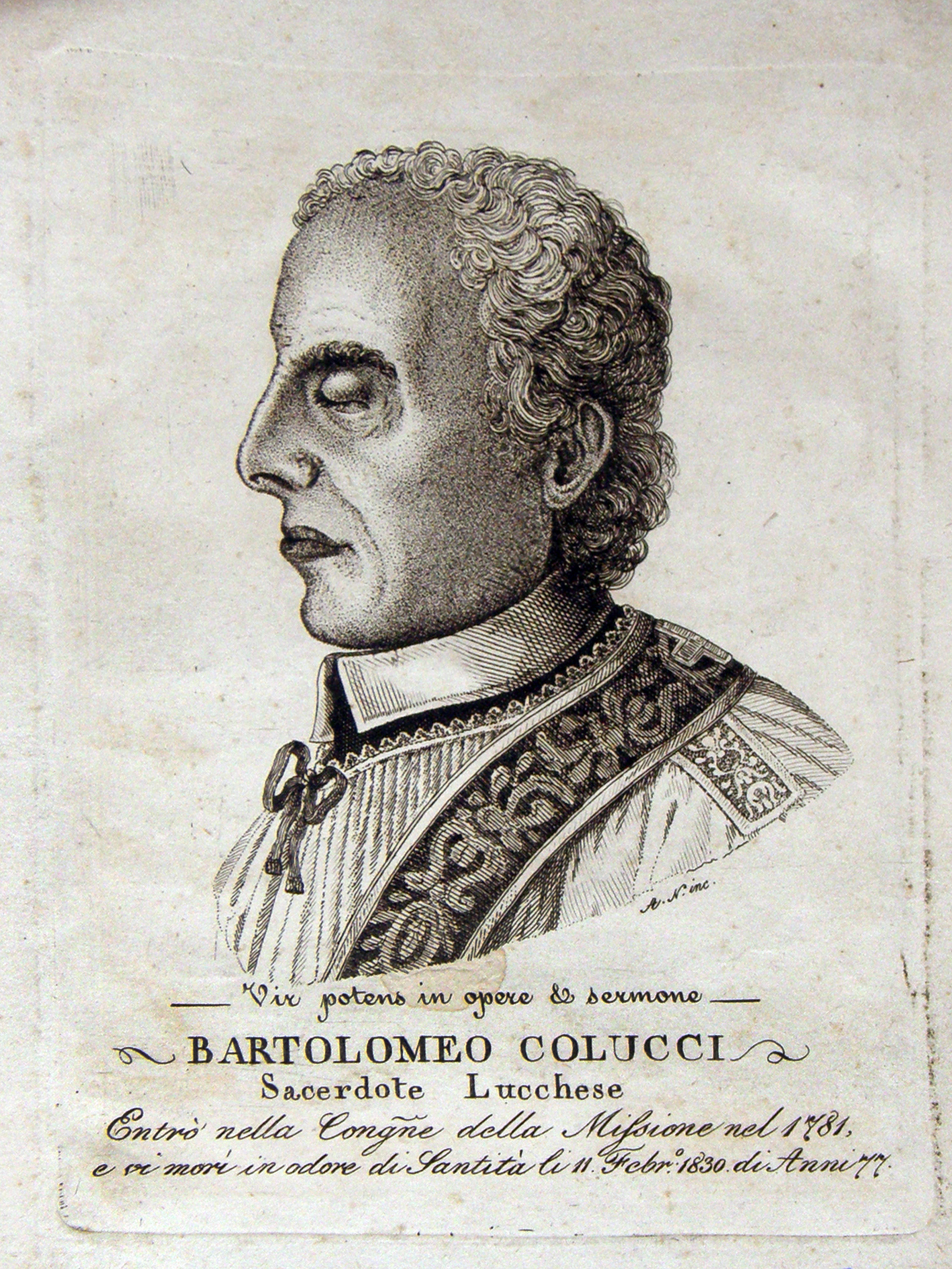 Text: Joined the Congregation of the Mission in 1781; died there in the odor of sanctity, 11 February 1830, age 77. Engraving in Collegio Leoniano archives, Rome
