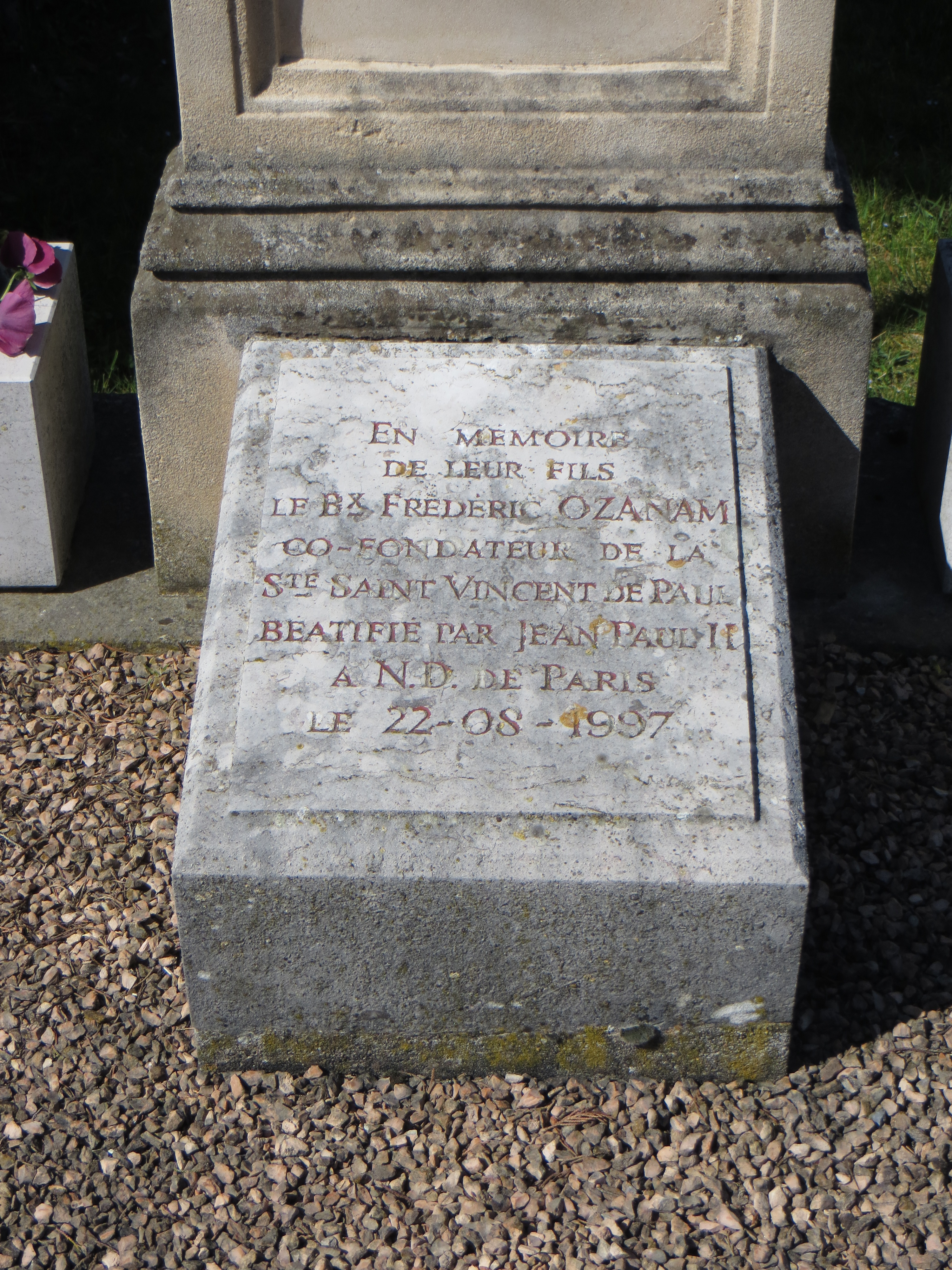 Text: In memory of their son, Bd. Frederic Ozanam, cofounder of the Society of SVdP; beatified by John Paul II, at Notre Dame, Paris, 22 August 1997