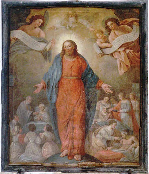 St. Vincent image at lower left, spiritual work of mercy; original in parish church of L'Huitre, painted for Confraternity of Charity; note God the Father and dove of Holy Spirit above