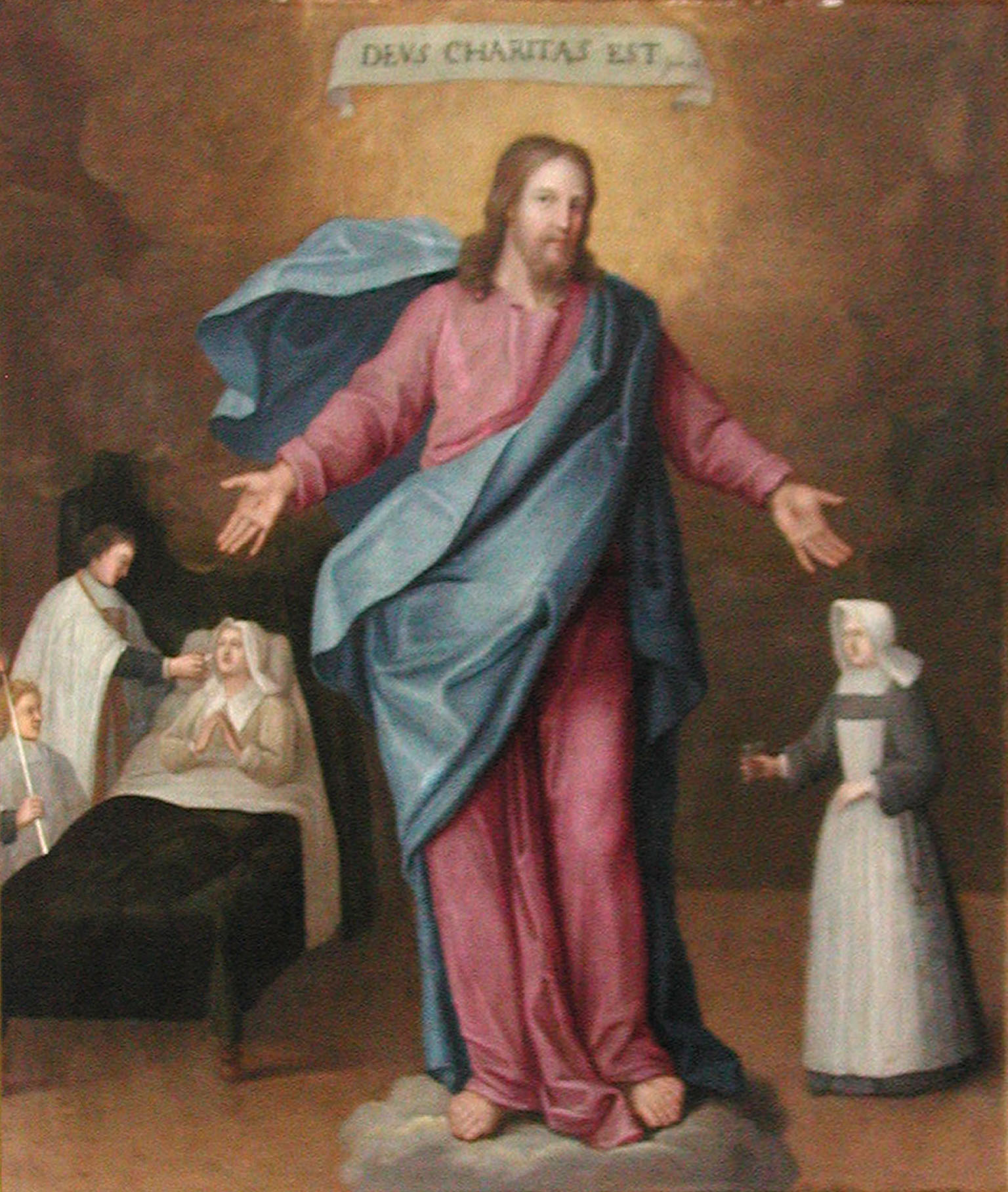 Original in mother house of Daughters of Charity; Sister in contemporary grey habit bringing glass to a sick person; painted for Confraternity of Charity