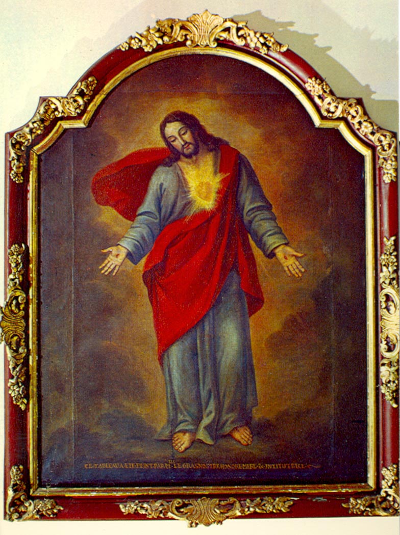 St. Louise incorrectly identified as painter of entire canvas; she painted only the Sacred Heart; original in mother house of Daughters of Charity, Paris; painted for Confraternity of Charity