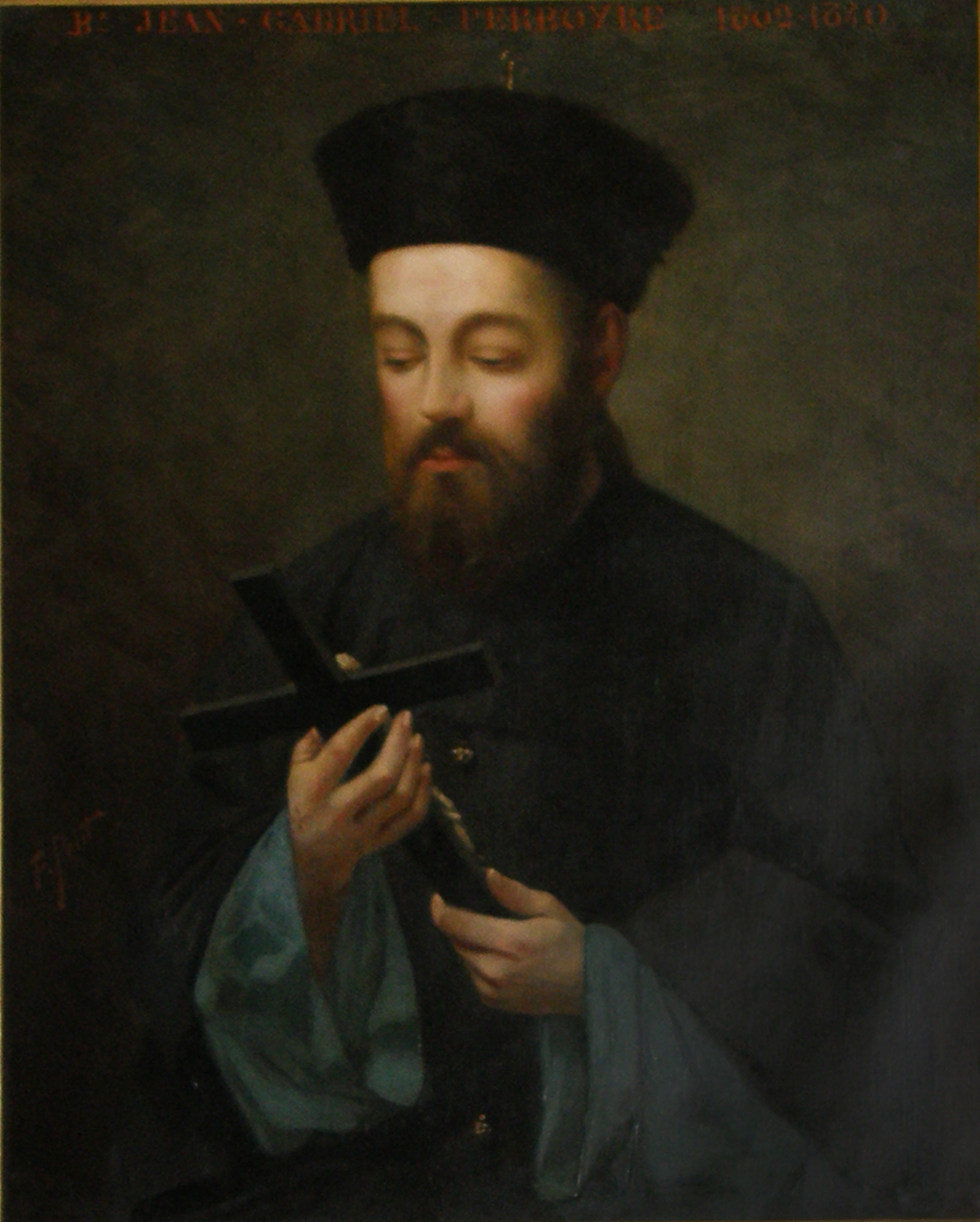 Text at top: B [Blessed] John Gabriel Perboyre, 1802-1840; original in CM mother house, Paris; Perboyre in Chinese garb, contemplating the crucifix. Artist: F. Petit, 1889. Signature lower left.