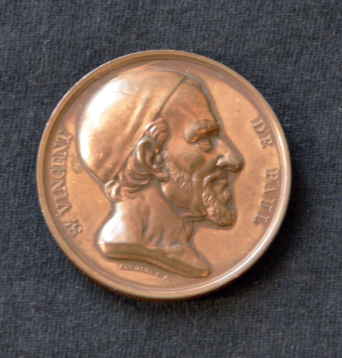 Round copper medallion, Vincent de Paul bust in classical profile, no clothing except for skullcap; sculptor, [Jacques Auguste] Fauginet; reverse, not shown, dated 1851, for Enfants Trouvés