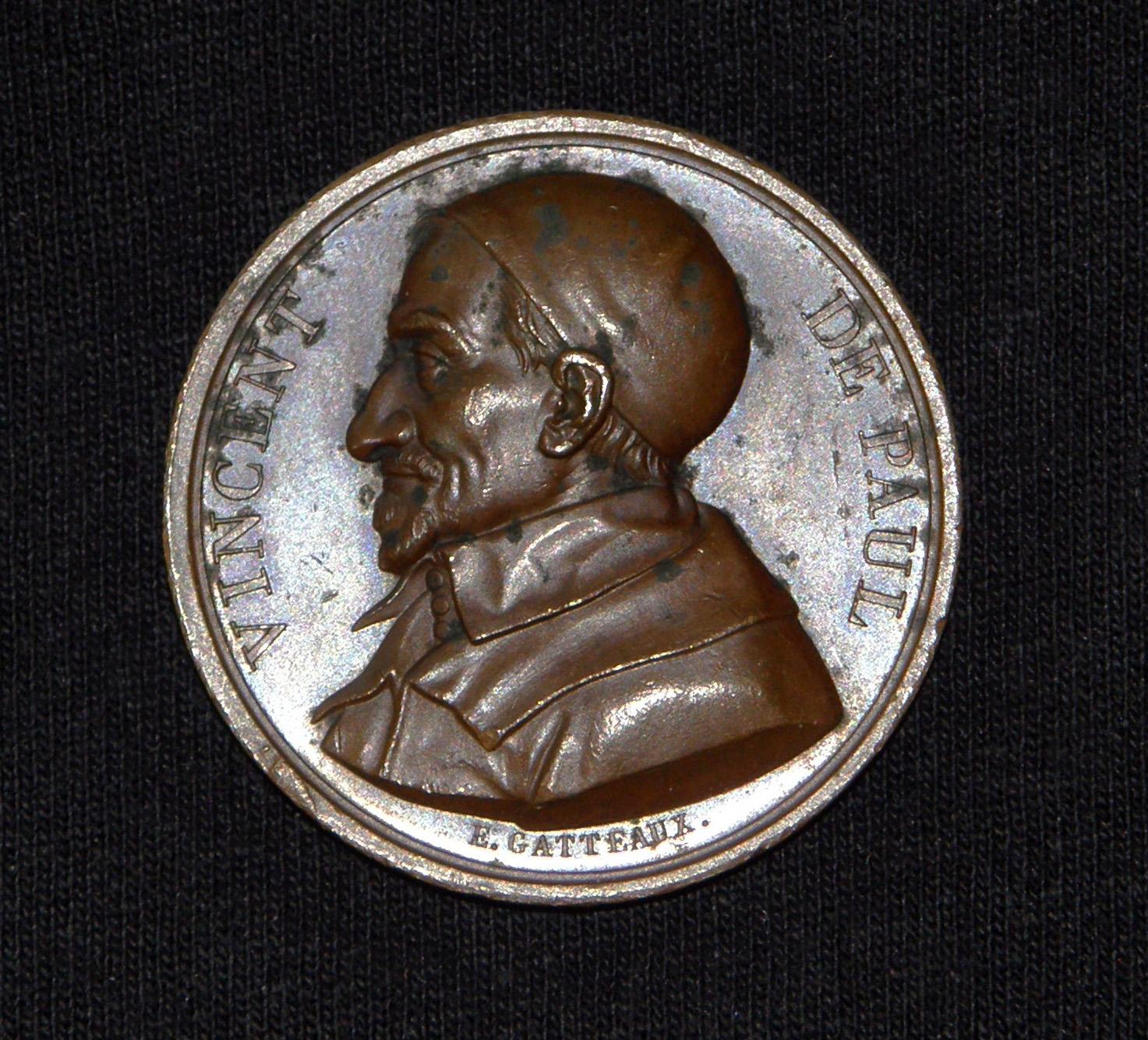 Round copper medallion; Vincent de Paul, cassock, mantle, skullcap; engraver's name below, [Jacques-Edouard] Gatteaux