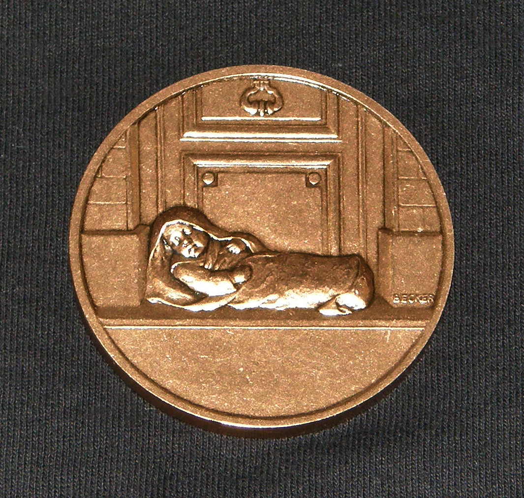 Reverse, sleeping foundling in front of a door, prominent knocker above; signed Becker