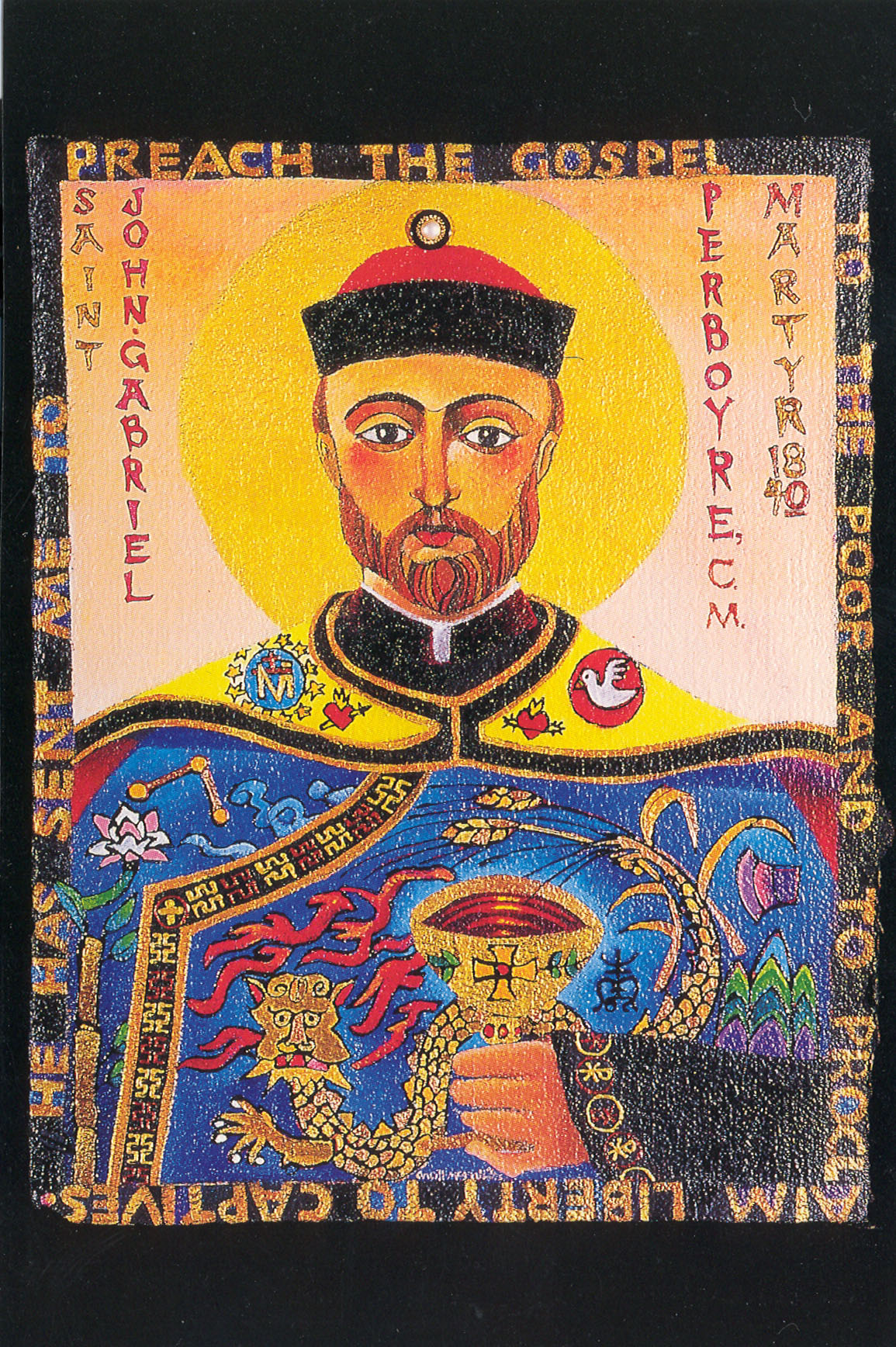 Artist: Michael O'Neill McGrath Symbols: crown of martyrdom, with pearl of great price; peach background: immortality; character shou (long life); flames: light of Christ, Holy Spirit