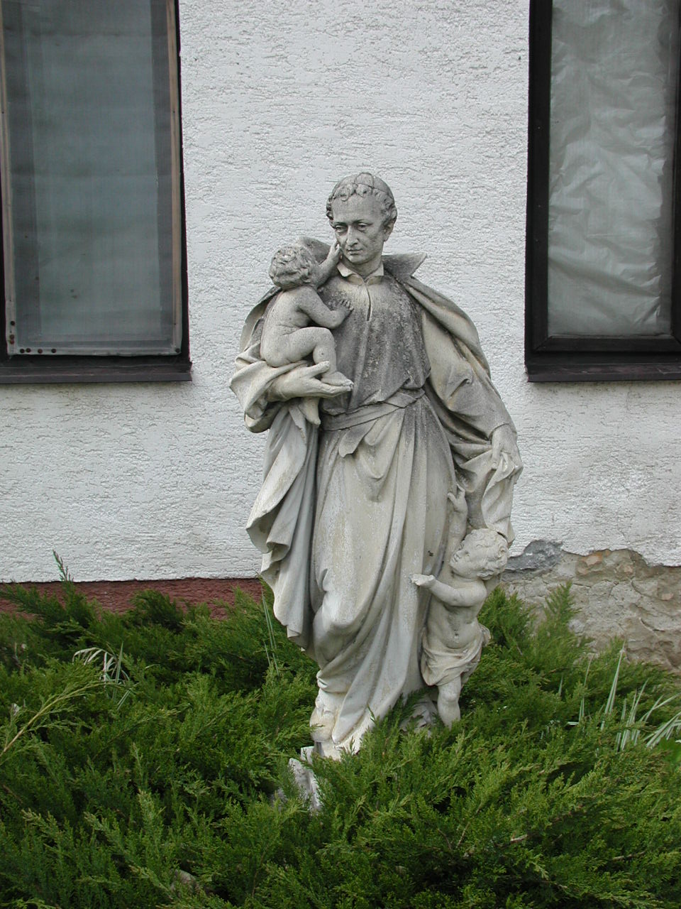 Outdoor statue, supposedly Vincent de Paul, clean shaven, with two children. Baroque style; original in Bijacovce, Slovakia; later moved to Lucenec