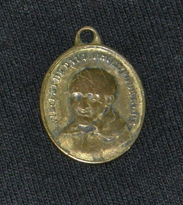 Oval copper medal, with loop; Vincent de Paul, cassock, mantle, skullcap, French text, Vincent de Paul, pray for us