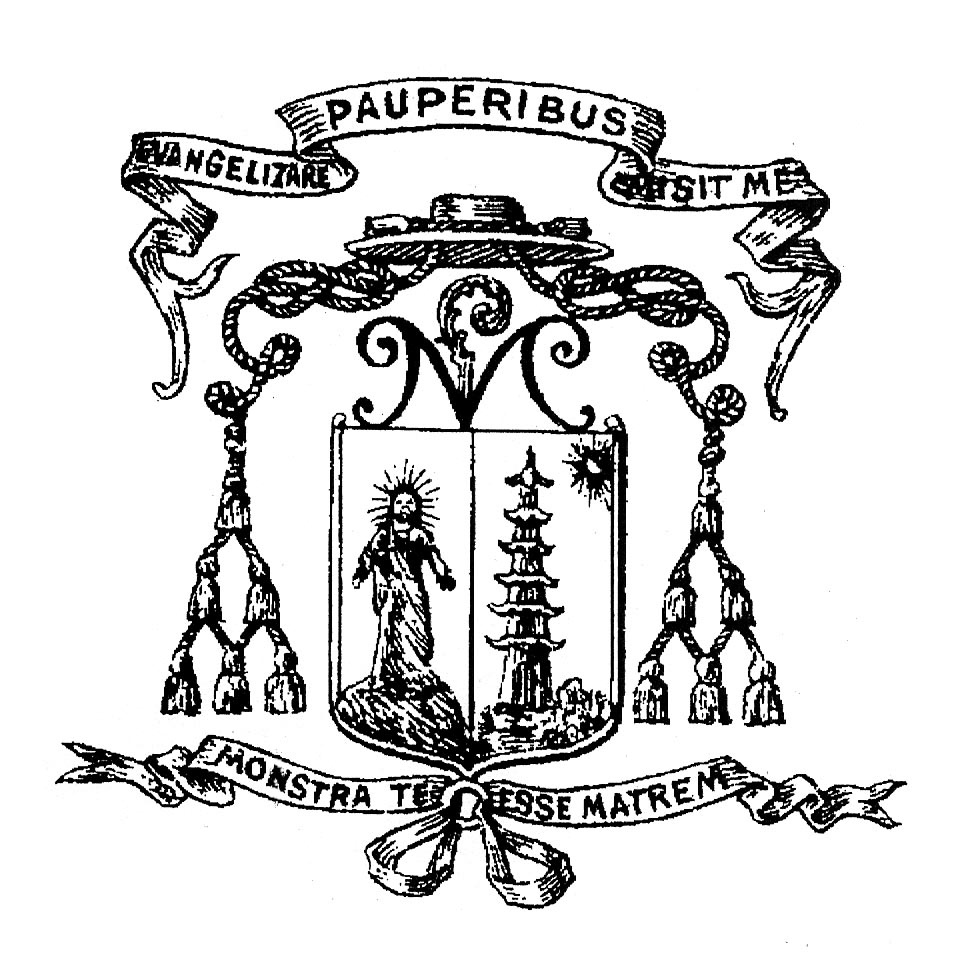 Upper motto: He has sent me to preach the Gospel to the poor; lower motto: Show thyself a mother. Risen Christ emplem on left; pagoda and star on right Stylized M above shield (Mary)