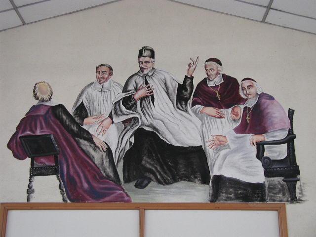 Mural; Vincent de Paul, seated, cassock, surplice, biretta, teaching gesture; with priests and bishops; based on beatification engraving; original in Vincentian Provincial House chapel, Guatemala City