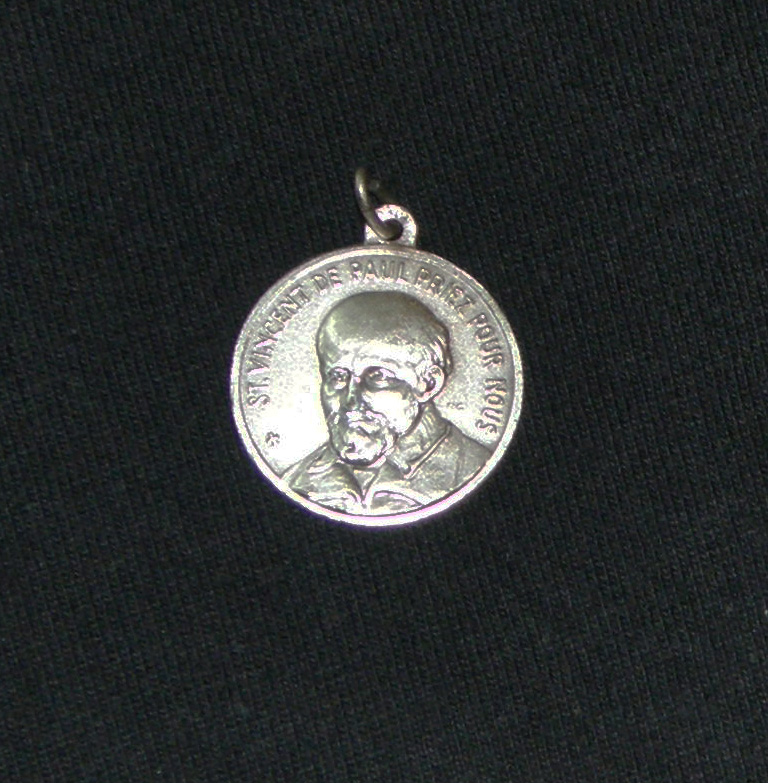 Obverse, small round silvered medal, with loop and ring; Vincent de Paul, cassock, mantle; French text: Pray for us.