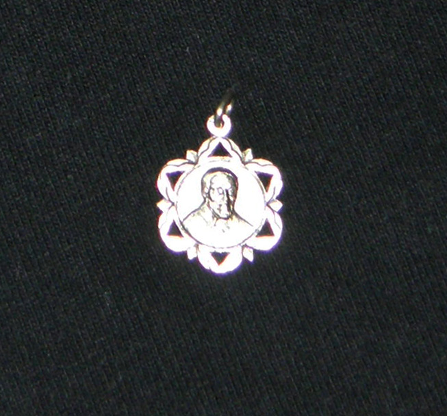 Obverse, small white metal medal, with open-work border, loop and ring; Vincent de Paul bust, cassock, surplice (?), skullcap
